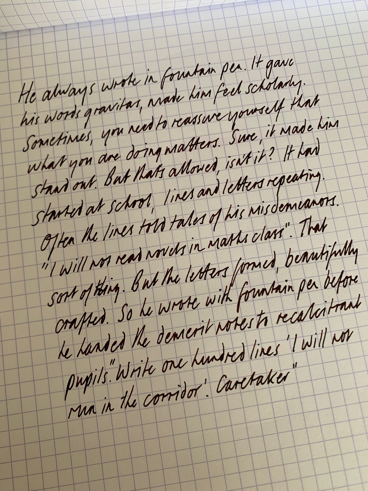 Everything was different. It was intentional. More thoughtful. Measured. I wrote some words and felt a story unfold. I was handwriting it so there had to be a fountain pen in the story. I needed an unexpected user of a fountain pen. That’s the way the story evolved. I wrote more words. Counted them. Checked where the tale was up to. Plenty of words left. Wrote a few more, set the scene, coloured in the character.