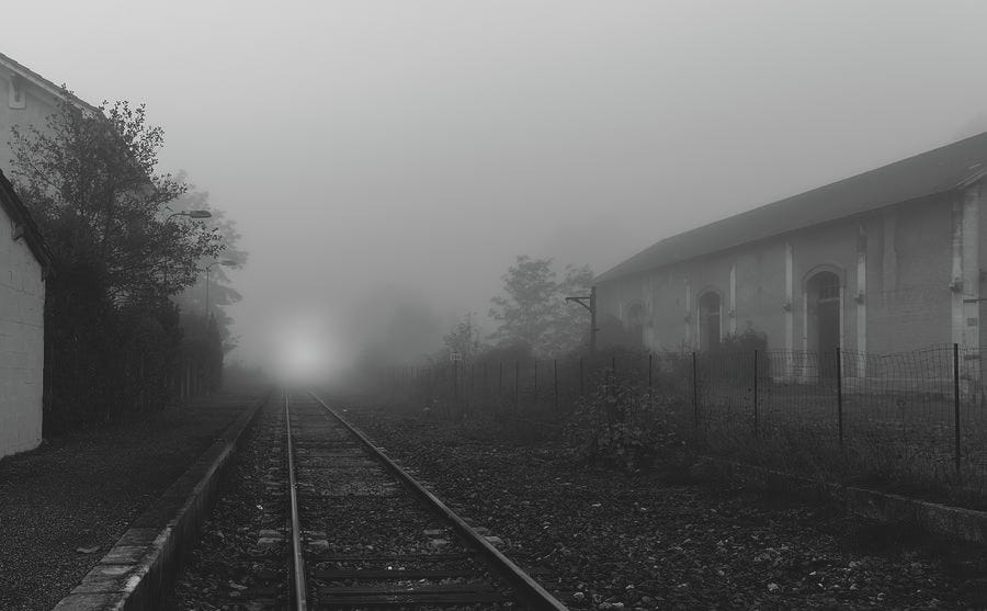 The change of seasons announced itself with an icy whisper. It pecked at my weakened chest with each laboured breath. Mist swirled, lacing itself into the heavy boots issued as part of the uniform. My eyes lingered on the cracked and mossy stones at the edge of the platform reserved for local stopping services. A squeak unnerved me, a piercing screech as an ancient clock shifted in its housing. I wonder where they keep the oil. Buildings loomed out of the dense fog, edging in and out of view. An owl reminded me - and anyone else out at this godforsaken hour - that it was a moment for the creatures of the night. I was an interloper, out of time, too early, or too late. Trees guard the approach, muffling the hoot but not the shriek of the hunted as death glides by, sharp talons gathering up an unsuspecting morsel. I had always been nervous as a child. As a young man, I steeled myself for the dark but what I had lived through had strengthened my resolve. The ghosts of my past visit me in the silence of the night, but I am safe - I know - in my waking hours. The light outside the Station Master’s office glowed dimly on the far platform. I should get over there now. Letting the stove die on my first day as his assistant would not do.